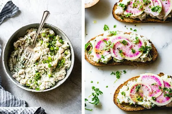 Pâine prăjită cu pastă cremoasă de fasole albă și legume proaspete deasupra — un mic dejun sățios, bogat în proteine vegetale și fibre, fără gătit aproape. O alternativă sănătoasă și gustoasă la clasicul sandviș.