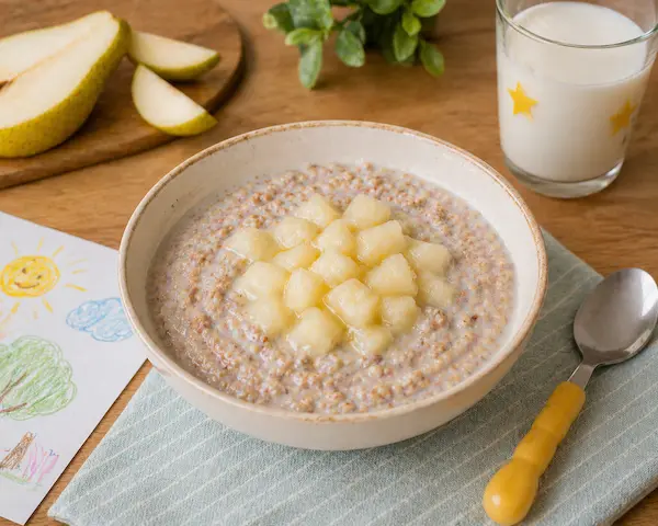 Hrișcă fiartă cremos în lapte cu pere dulci deasupra — fără gluten, bogată în minerale și cu un gust ușor de nucă. Un mic dejun cald și hrănitor pentru copiii mai mari, o alternativă delicioasă la terciul clasic de ovăz.
